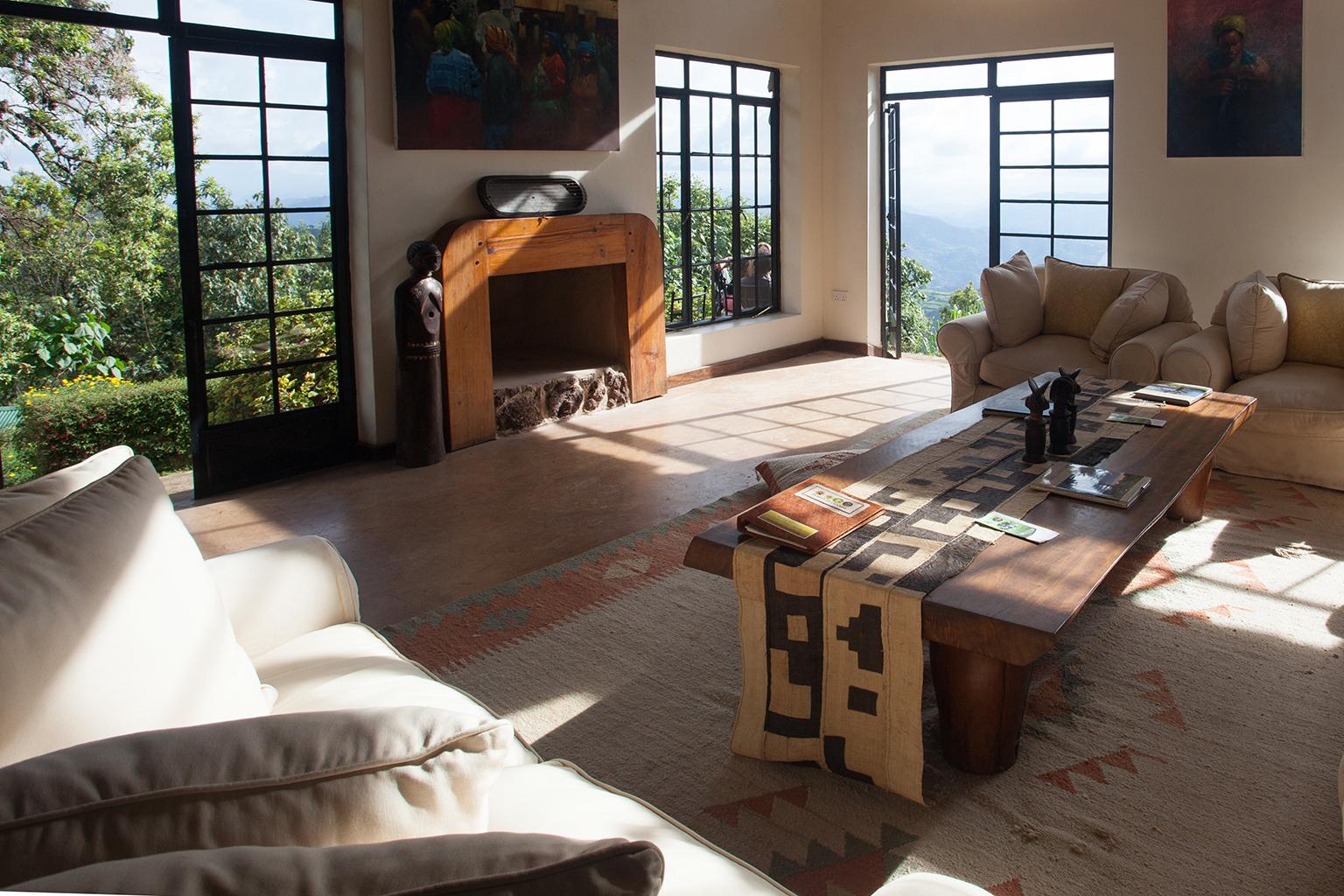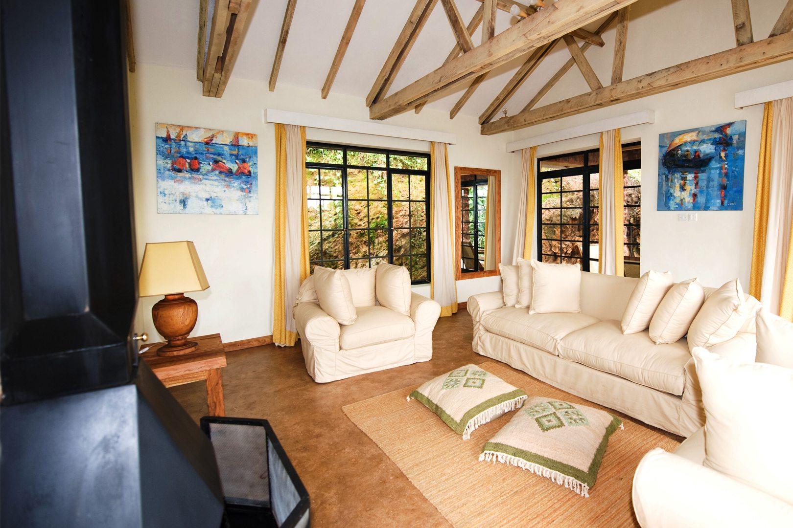 Guests at Clouds stay in their own cottage. Built of local volcanic stone, every cottage has a large sitting room with fireplace, vast overstuffed armchairs, and hand-woven carpets. Each individual cottage features the work of one of Uganda’s most respected artists (we call them the ‘Clouds 9’). Their work has been so highly regarded by guests that they have commissioned their own pieces and now the work of these artists graces the walls of homes and offices in New York, Toronto, Vancouver, Los Angeles, and London.