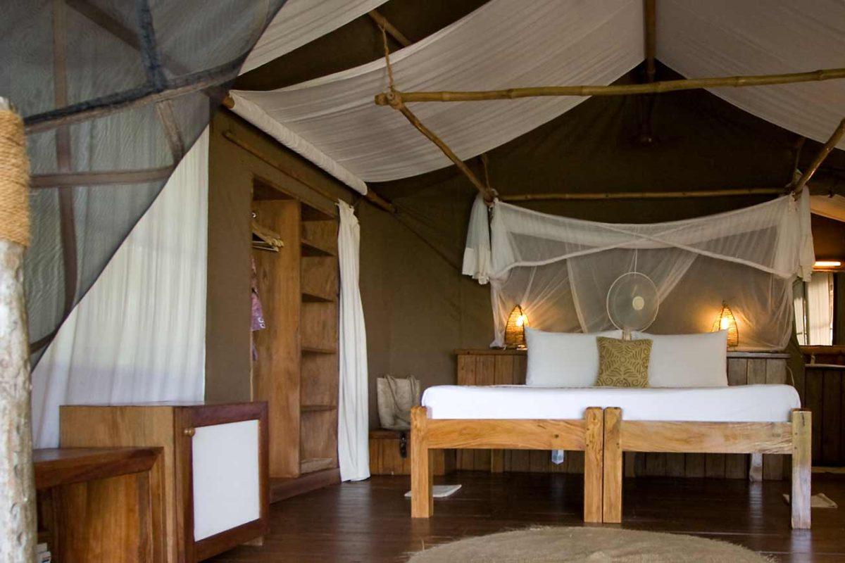 There are 18 rooms at Fundu Lagoon, consisting of canvas tents set under makuti (thatch) roofs on wooden decks, all with views over the sea. The rooms are equipped with large double or twin beds, mosquito nets, ceiling and standing fans, and indoor and outdoor seating areas. Each has an ensuite bathroom with fresh hot water shower, toilet and basin.