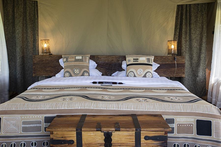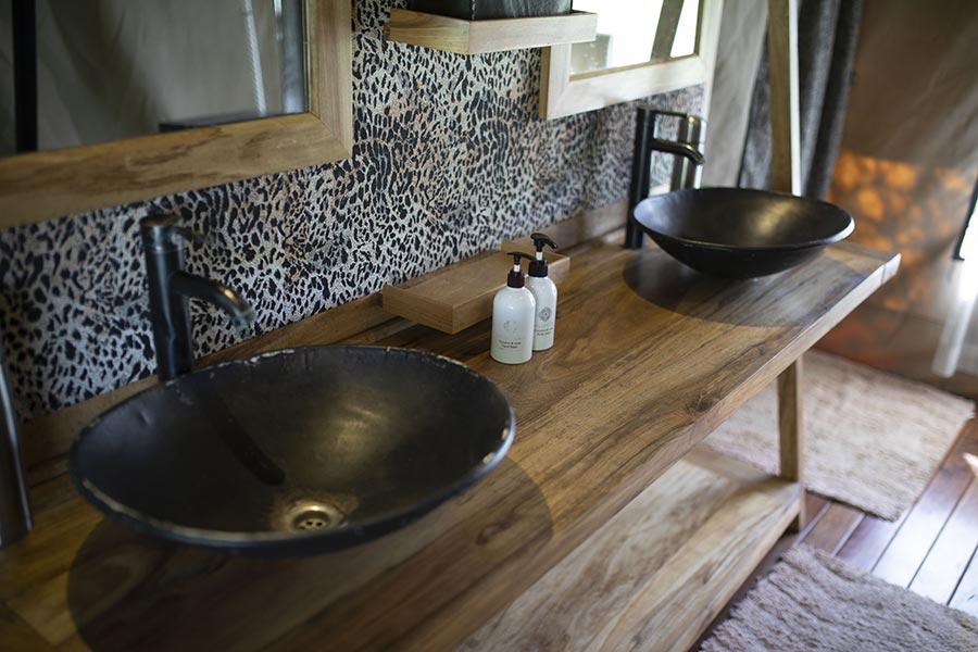 Ensuite bathroom, flush toilet, double wash basins with running water, safari-style bucket shower and other essential amenities