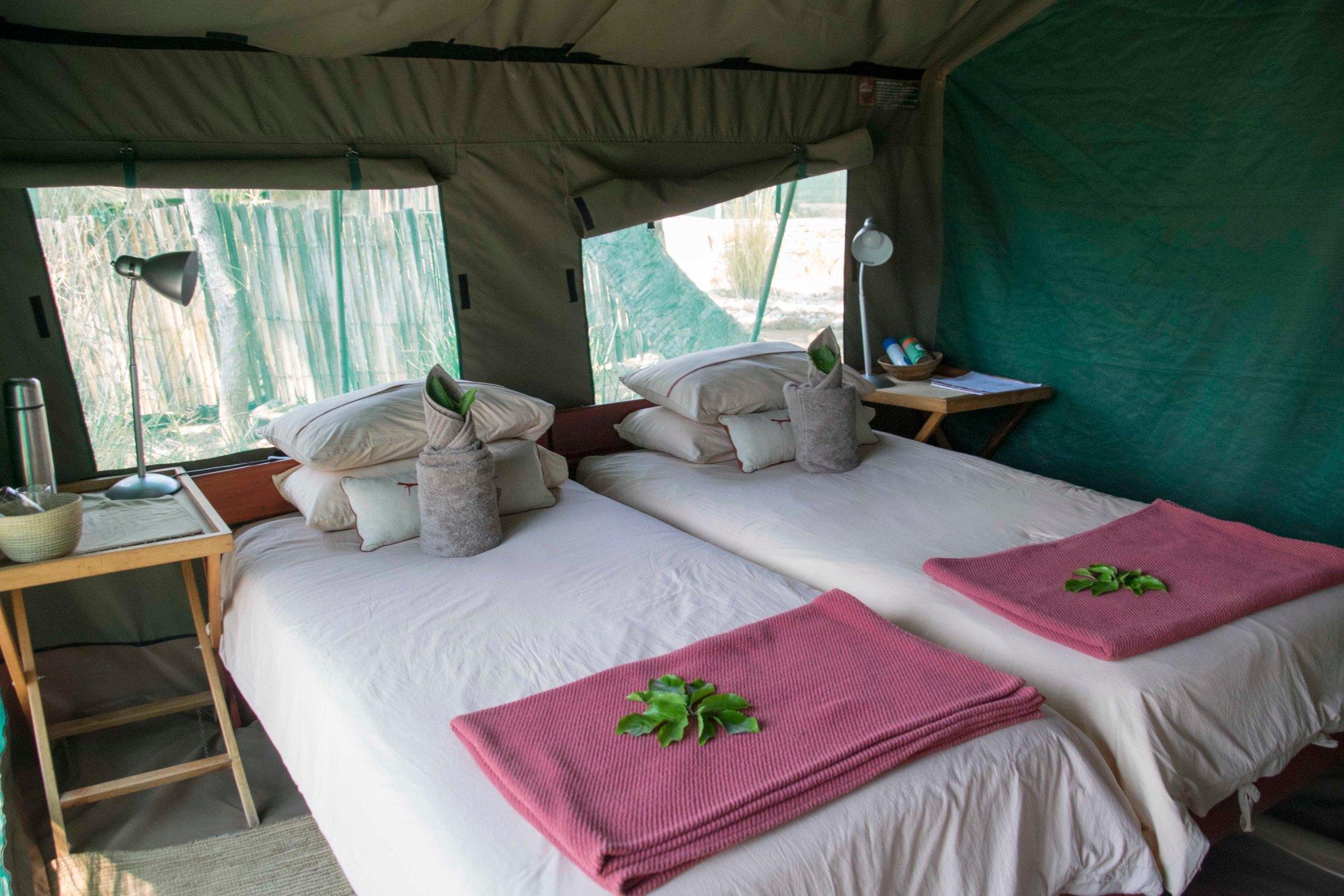 The ten comfortable safari-style tents consist of eight twin tented rooms, one honeymoon tented room with a queen-sized bed and a four-bed family tented room, all with en suite bathrooms. The tents have electrical lights and mosquito netting at the windows and doors. Shaded patios in front of the tents overlook the Kunene River on its flow to the Atlantic Ocean.